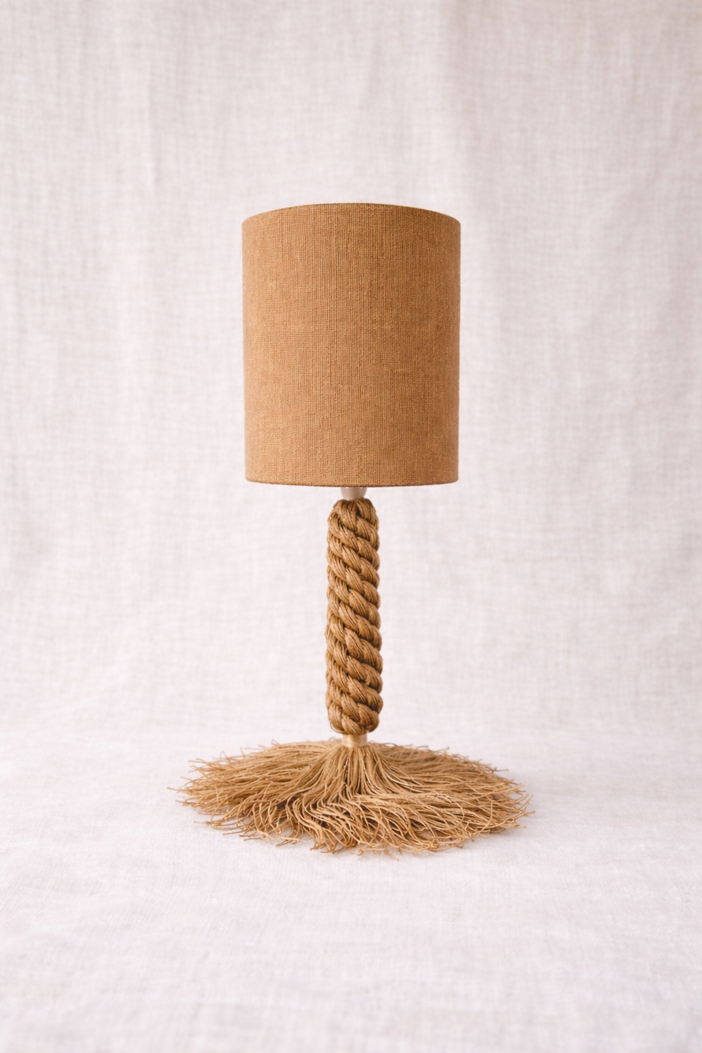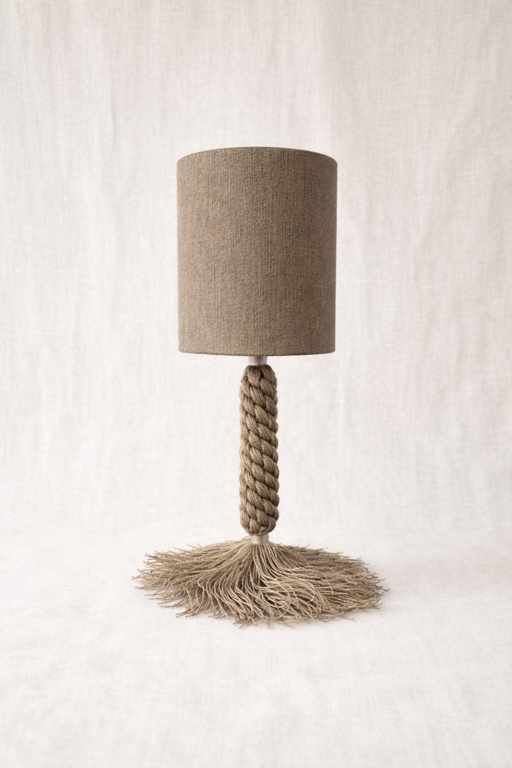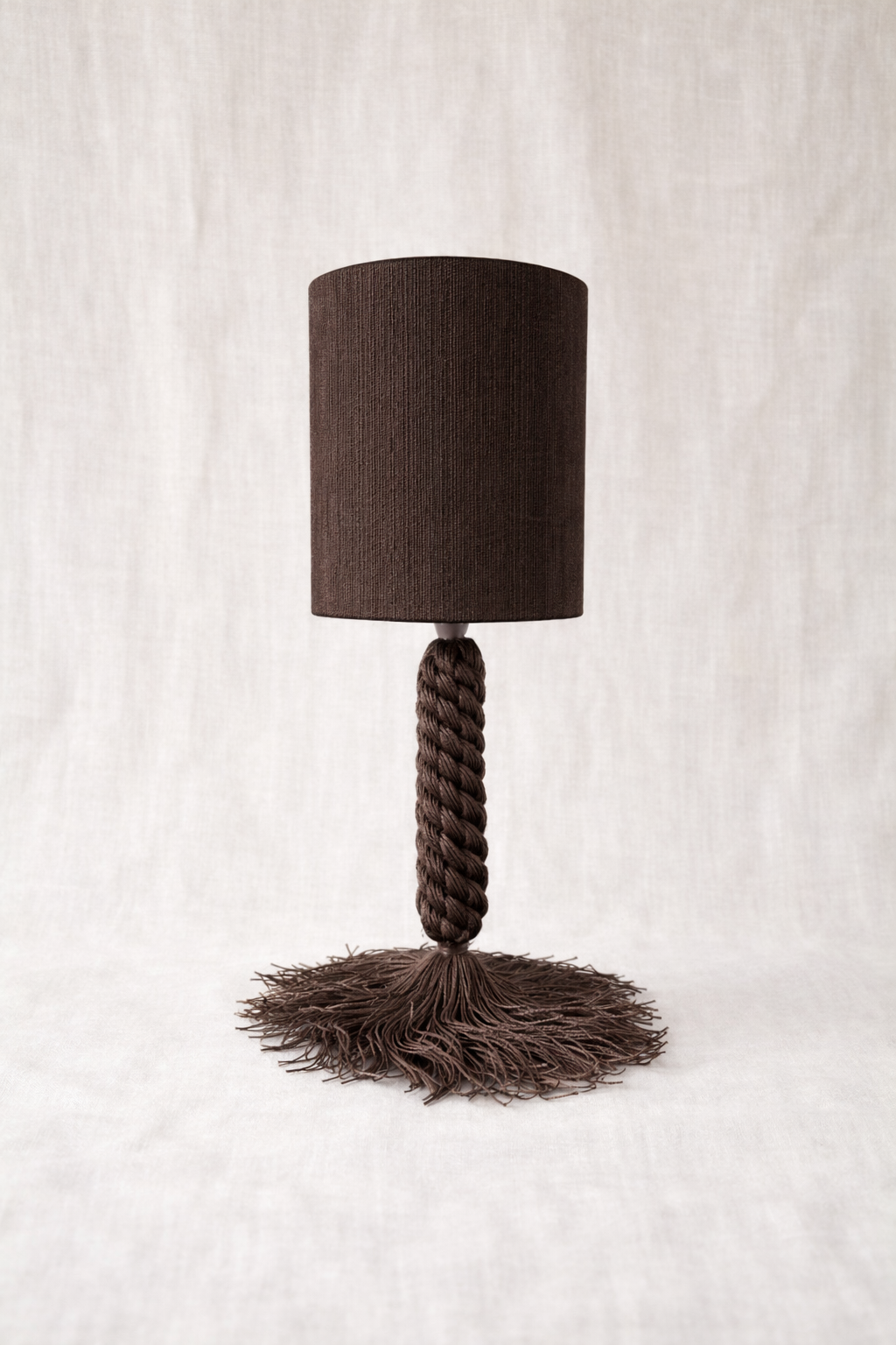 Inspirada en los pinos de los bosques mediterráneos, Pinea evoca la verticalidad de los troncos y la textura orgánica de las piñas. Su trenzado artesanal y el movimiento natural de los flecos aportan solidez visual, calma y un carácter profundamente natural.